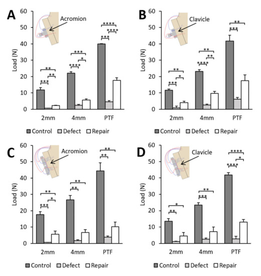 Load at 2 mm, 4 mm and peak translational force at dislocation between the humeral head and glenoid for four scenarios. In each group, testing was performed for control glenoid, 30% by-width defect glenoid and after repair with (A) modified buckle-down technique with acromion, (B) modified buckle-down technique with clavicle, (C) cross-link technique with acromion or (D) cross-link technique with clavicle. PTF: peak translational force. Values are expressed as mean ± SEM with n = 6 in each group. * p < 0.05, ** p < 0.01, *** p < 0.001, **** p < 0.0001. Comparisons within groups were performed using one-way ANOVA with repeated measures.