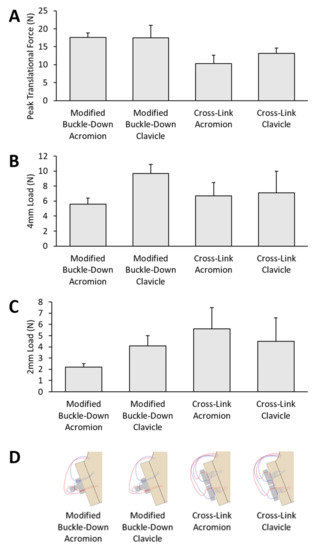 At 4 mm displacement, the modified buckle-down technique with clavicle restored the highest load (10 ± 1 N), which was 42% of control (23 ± 1 N). At 2 mm displacement, the cross-link technique with acromion restored the highest load (6 ± 2 N), which was 32% of the control (18 ± 2 N) (Figure 8).