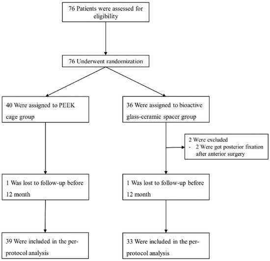 A total of 76 participants were assessed for eligibility, and all of them provided consent to undergo randomization into one of the treatment groups. The allocation of participants was conducted randomly, resulting in Group C (n = 40) or Group N (n = 36). None of the randomized treatment strategies exhibited any crossover. Two subjects were excluded from group N because they underwent posterior fixation after anterior surgery. Two subjects were excluded from the PP analysis due to loss of follow-up postoperatively (one patient in group C and one patient in Group N). Consequently, the final analysis comprised a total of 74 patients. The flow diagram of the study and follow-up is depicted in Figure 2.