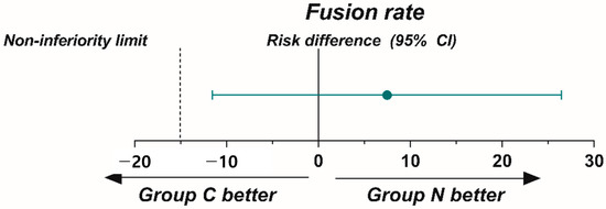 On follow-up CT scans at 12 months postoperatively, fusion was achieved in 29 participants in group C (74.4%; 29/39) and 27 participants in group N (81.8%; 27/33). The risk difference between the two groups was 7.4% (95% CI: −11.5% to +26.5%). The noninferiority of the BGS-7 spacer was confirmed (Table 2 and Figure 3). The Kappa value for interobserver reliability was 0.774, indicating substantial agreement. The Kappa values for intraobserver reliability were 0.891, 0.818, and 0.813 for each rater, respectively, indicating nearly perfect agreement.