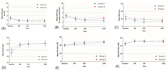 Changes in secondary outcomes between the two groups during the 12-month follow-up period. (A) Changes in mean VAS neck pain score, ranging from 0 (no pain) to 10 (worst pain). (B) Changes in mean VAS upper extremity pain score, ranging from 0 (no pain) to 10 (worst pain). (C) Changes in mean NDI score, ranging from 0 (no disability) to 100 (high disability). (D) Changes in mean EQ-5D value, ranging from 0 (worst quality of life) to 100 (best quality of life). (E) Changes in mean SF-12v2 PCS and (F) MCS score, with higher scores indicating better HRQOL. Error bars indicate 95% confidence intervals. VAS, visual analog scale; NDI, Neck disability index; EQ-5D, European Quality of Life-5 Dimensions; SF-12, 12-item short form health survey; PCS, physical component summary; MCS, mental component summary.