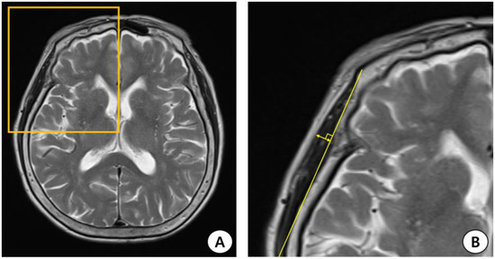 Process of measuring temporal muscle thickness (TMT) on the brain magnetic resonance image (MRI). (A) Axial T2-weighted MRI at the orbital roof level. (B) The Sylvian fissure is defined as a reference point in the anterior–posterior orientation. TMT was measured perpendicular to the long axis of the temporal muscle.