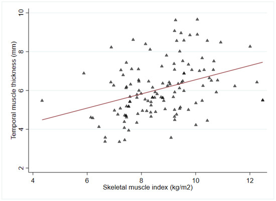 In the present study, the positive correlation between TMT and SMI was significant; however, the correlation was relatively weak. Previous studies have consistently reported a positive correlation between TMT and skeletal muscle mass. In a study conducted by Cho et al., the correlation between TMT and ASM was retrospectively evaluated in individuals diagnosed with dementia using cranial MRI and DXA [45]. They found a significant association between TMT and ASM, with an R-value of 0.379 (p = 0.001). Another study by Ten Cate et al. investigated the association between TMT and systemic muscle loss in patients newly diagnosed with glioblastoma [46]. They measured skeletal muscle mass at the L3 level using abdominal computed tomography, confirming its correlation with TMT, with an R-value of 0.537 (p < 0.001). However, the degree of correlation may vary depending on the imaging modality used for TMT measurement; various equipment for measuring the skeletal muscle mass, such as ultrasonography, DXA, and BIA; or the specific disease being investigated.