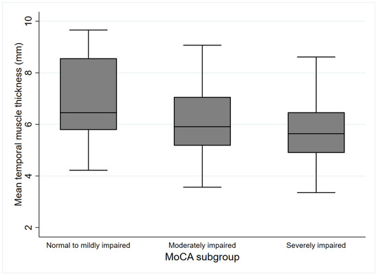 Mean temporal muscle thickness according to MoCA-defined subgroups. MoCA: Montreal cognitive assessment.