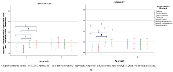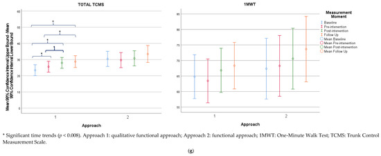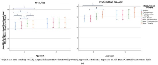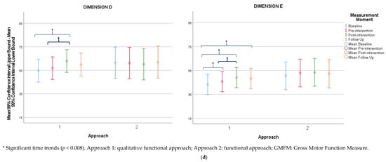 When comparing both approaches as two matched groups of 12 participants, the results revealed significant time-by-approach interaction effects for all attributes of the QFM and dimensions C, D, and total CDE of the GMFM (Appendix A, Table A14). The qualitative functional approach showed significant time trends for all attributes of the QFM and dimensions C, D, E, and total CDE of the GMFM. A significant time trend was found in the functional approach for the coordination attribute of the QFM. For both approaches, no significant time trends were found for the TCMS and gait capacity.