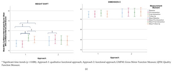 The results revealed significant time-by-approach interaction effects for all attributes of the QFM and dimension D and total CDE of the GMFM (Table 2). The qualitative functional approach showed significant time trends for all attributes of the QFM; dimensions D, E, and total CDE of the GMFM; and two subscales (static sitting balance and selective movement control) and total score of the TCMS. No significant time trends were found for the QFM and the GMFM with the functional approach.