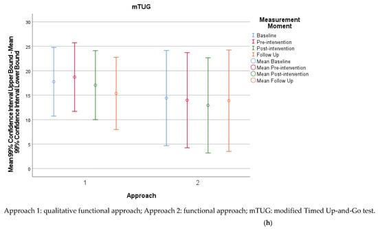 For the qualitative functional approach, the mean pre- to post-intervention difference and SD for the 1MWT were 3.40 m and 16.16 m, respectively, resulting in a small ES of 0.28 (Table 7). For the functional approach, the mean pre- to post-intervention difference and SD for the 1MWT were 2.31 m and 19.06 m, respectively, resulting in an ES of 0.12. For the qualitative functional approach, the mean pre- to post-intervention difference and SD for the mTUG were −1.66 s and 19.04 s, respectively, resulting in an ES of 0.12. For the functional approach, the mean pre- to post-intervention difference and SD for the mTUG were −1.06 s and 12.76 s, respectively, resulting in an ES of 0.06.