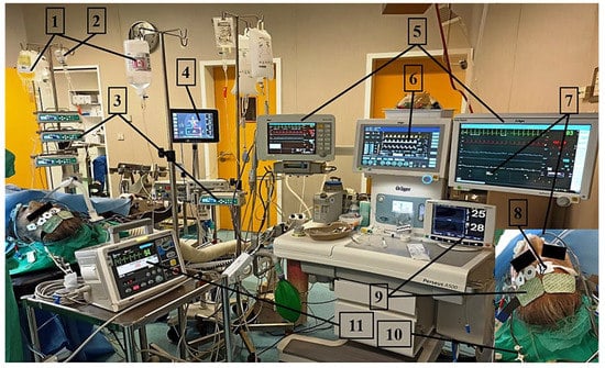 Post-resuscitation care after intraoperative cardiac arrest. A 67-year-old man with a history of end-stage renal disease, heart failure, and pulmonary hypertension underwent emergency surgery (American Society of Anaesthesiologists physical status 5E) due to uncontrolled hemorrhage from an infected axillary-axillary synthetic loop graft. The patient was in hemorrhagic and septic shock upon arrival to the operating room. Two hours after induction of anesthesia, he suffered an intraoperative pulseless electrical activity cardiac arrest. The patient was resuscitated according to the PERSEUS treatment strategy (NCT04428060) [] and received two i.v. bolus doses of epinephrine 500 μg in order to maintain a diastolic arterial pressure > 40 mmHg during CPR and hydrocortisone 200 mg. A systemic vascular resistance of 1000–1100 dynes s−1 cm−5, end-tidal carbon dioxide of 15–18 mmHg, and central venous pressure (CVP) of 6–7 mmHg were recorded during CPR. Spontaneous circulation was restored after 2 min of CPR. Post-resuscitation cardiac ultrasound revealed left ventricular hypertrophy with severe systolic dysfunction (LVEF: ~30%, TR: 3+/4+) and a systolic pulmonary artery pressure of 65–70 mmHg. Inferior vena cava diameter and CVP were 2 cm and 18 mmHg, respectively. The patient was initially supported with noradrenaline 1 μg kg−1 min−1 and dobutamine 4.17 μg kg−1 min−1. Depth of anesthesia was adjusted to maintain bispectral index between 39 and 44 with full neuromuscular blockade. Lung-protective ventilation and targeted temperature management (35.2–35.5 °C) were applied. Esmolol infusion was started due to increased heart rate (sinus rhythm 138 beats min−1; noradrenaline 1 μg kg−1 min−1, dobutamine 4.17 μg kg−1 min−1, esmolol 14.58 μg kg−1 min−1). Subsequently, arginine vasopressin (AVP) was added to facilitate decatecholaminisation and mitigate the effects of noradrenaline on pulmonary vasculature (noradrenaline 0.4 μg kg−1 min−1, AVP 0.05 IU min−1, dobutamine 2.92 μg kg−1 min−1, esmolol 14 μg kg−1 min−1). Thereafter, esmolol was replaced by landiolol in an effort to lower the ventricular rate without markedly deteriorating hemodynamics (noradrenaline 0.37 μg kg−1 min−1, AVP 0.05 IU min−1, dobutamine 2.7 μg kg−1 min−1, landiolol 6 μg kg−1 min−1). Tranexamic acid was administrated, and the patient was transfused with a packed red blood cell/fresh frozen plasma/platelets ratio of 2:1:1 (total 6:3:3). Intraoperative time (skin-to-skin) was four hours. After another two-hour intensive care in the operating room, the patient was transferred to the intensive care unit, from which he was discharged 7 days later with a cerebral performance category score of 1. 1: fluid resuscitation and transfusion; 2: total intravenous anesthesia; 3: medical infusion pumps; 4: FloTrac/EV1000 clinical platform; 5: patient monitors providing information in numerical and waveform formats; 6: mechanical ventilator parameters and waveforms; 7: temperature control; 8: bispectral index (BIS) monitoring; 9: regional cerebral oxygen saturation (rSO2); 10: internal jugular vein cannulation; 11: manual external defibrillator/pacemaker.