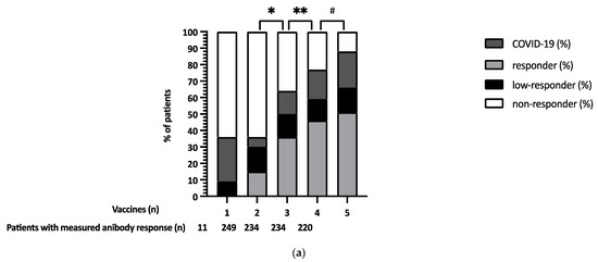 (a) SARS-CoV-2-specific cumulative antibody response after 1–5 vaccinations in LTx patients. * p-value < 0.001 for the difference between responders after the 2nd and 3rd vaccination. ** p-value < 0.001 for the difference between responders after the 3rd and 4th vaccination. # p-value 0.21 for the difference between responders after the 4th and 5th vaccination. (b) Percentage of former non-responders responding after 1–5 SARS-CoV-2 vaccines in LTx patients.