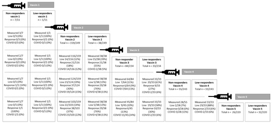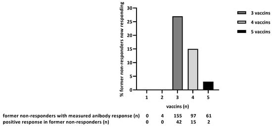 The number of patients with a positive antibody response increased after each vaccination, starting from vaccination 2 (Figure 1a,b). A total of 42/154 (27%) of the non-responders after the second vaccine became responders after the third vaccine; 15/97 (15%) of the non-responders after the third vaccine became responders after the fourth vaccine; 2/61 (3%) of the non-responders after the fourth vaccine became responders after fifth vaccine (Figure 1b). Figure 2 shows the responses of the non-responders and low responders after 1–5 vaccines. With the help of Figure 2, an attempt can be made to estimate the likelihood that a non-responder will become a responder after further vaccination. For example, a considerable percentage of low responders after 2 vaccines became responders after the third or fourth vaccine (55% and 76%). Similarly, 18 and 30% of non-responders after 2 vaccines became responders after a third or fourth vaccine. The addition of a fifth vaccine in non-responders or low responders after a fourth vaccine was only useful for a small number (3%) of LTx patients (Figure 1b and Figure 2). After 5 vaccines, 51% of the total population had an antibody response.