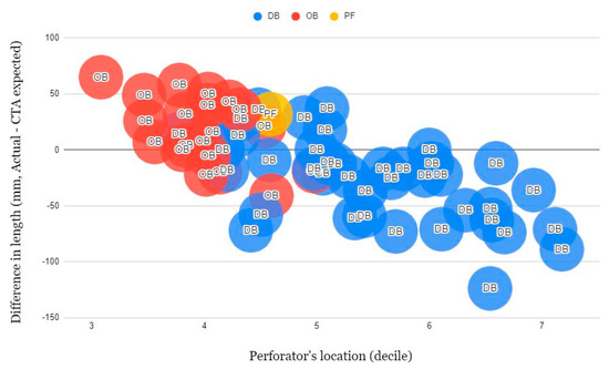 Regarding the discrepancy between expected and actual pedicle length, the more proximally located perforators tended to be longer than expected, and distally located perforators were shorter than expected (Figure 3).