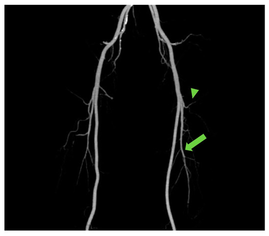 The maximum intensity projection (MIP) reconstruction showing the anatomy and course of perforators from transverse branch (arrowhead) and descending branches (arrow).