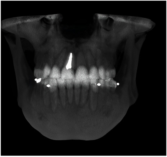This proof-of-concept study fulfilled the Declaration of Helsinki as revised in 2013 and was reported in compliance with the STROBE guidelines [31]. The study protocol was revised and approved by the ethical committee of “Facultad de Estomatología—Benemérita Universidad Autónoma de Puebla” with identification code 2018065 and registered in ClinicalTrials.gov with the identifier NCT05718050. Fully dentate patients, 18 years of age or older, in good health (ASA I and II) were recruited among all the patients in need of being treated for any type of dental disease or treatments, such as bone regeneration procedures, that consider a pre-CBCT examination and a post-operative follow-up with CBCT. Participants were recruited and signed the informed consent after being properly educated about the nature and the investigating procedures of the study [32]. Exclusion criteria included: active periodontitis with tooth mobility, absence of lower canines and or first molars, metal-based FDP in the canine or molar areas, neuromuscular disorders, temporomandibular joint disorders, parafunctional habits, any systemic condition preventing surgery, history of oro-maxillofacial radiation therapy, history of drug or alcohol abuse, heavy smoking, uncontrolled diabetes, pregnancy, or lactation. All the patients were screened and prepared according to a strict study protocol. A mandibular silicon impression was taken, and a vacuum-molded thermoplastic stent with radiopaque fiducial markers (steel ball bearings 4 mm Ø) on the facial side of the canines and molars was fabricated for each patient (Figure 1 and Figure 2).