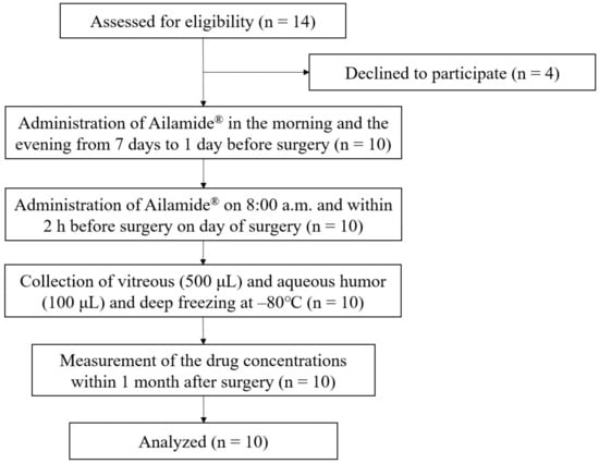 Overall, 14 patients were enrolled in this study. Four patients withdrew their consent after agreeing to participate due to concerns regarding the increased number of eye drops and the complexity of the procedure. The usage of Ailamide® (Senju Pharmaceutical Co., Ltd.) did not result in any adverse effects in those patients. The remaining 10 patients complied with the study protocol and were included in the analysis (Figure 1).