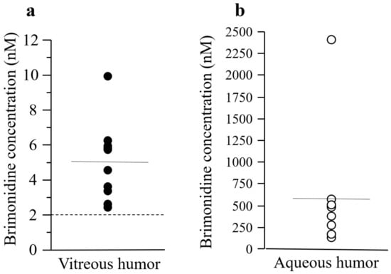 Concentration of brimonidine in vitreous (a) and aqueous (b) humor samples. Solid horizontal lines indicate the mean of the included data points. Dotted lines parallel to the x-axis denote the 2 nM concentration of brimonidine. Filled and open circles indicate the concentrations in vitreous and aqueous humor samples, respectively.