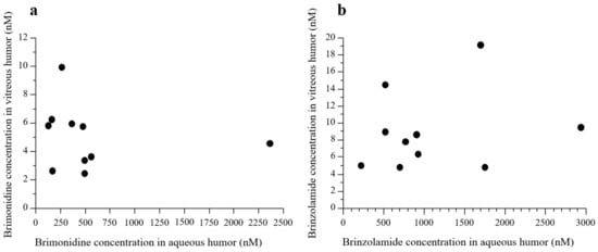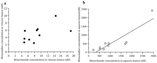 There was no statistically significant correlation detected between the concentrations of brimonidine and brinzolamide in the vitreous humor samples (p = 0.0789, R2 = 0.336) (Figure 5a). Nevertheless, a significant positive correlation was recorded in the aqueous humor samples (p = 0.0006, R2 = 0.792) (Figure 5b).
