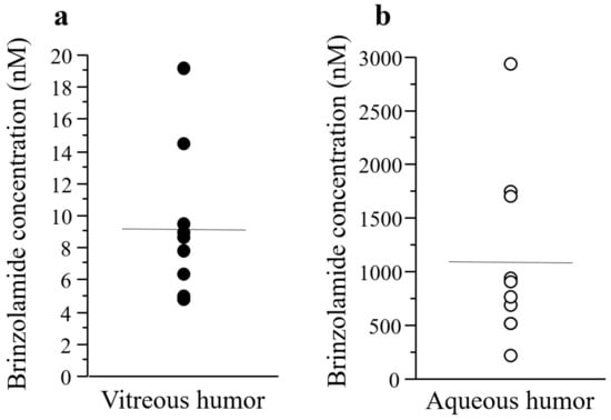 Statistical analysis was conducted using JMP 15 software (SAS Institute, Inc., Cary, NC, USA). Data are presented as the mean ± standard deviation. Ordinary least-squares regression analysis was used to assess the relationship between the concentrations of brimonidine and brinzolamide in the vitreous and aqueous humor samples. Changes in IOP after treatment were examined using a paired sample t-test. For all tests, the level of statistical significance was set at p < 0.05.