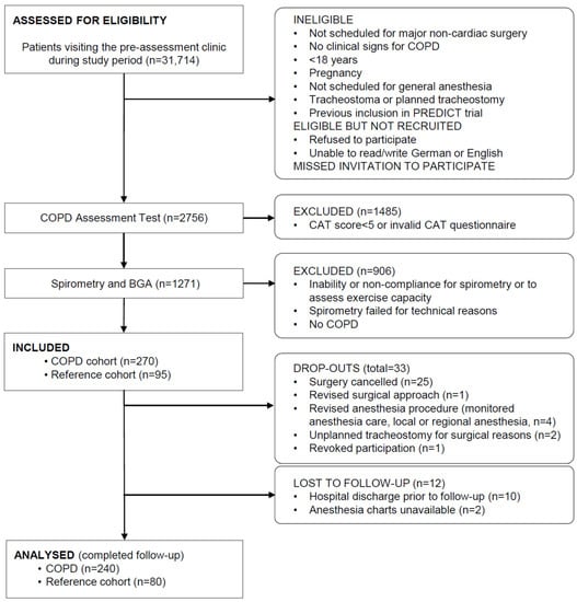 Adult patients who presented at our anesthesia preoperative assessment clinic between 18 November 2014 and 14 July 2016 were assessed for eligibility. Patients with GOLD key indicators for COPD [] and a COPD assessment test (CATTM) [] score ≥ 5 points, who were scheduled for major non-cardiac surgery, underwent a structured pulmonary risk stratification including preoperative spirometry. Spirometry was performed before and after bronchodilator application (200 µg salbutamol via a spacer) using a Spirobank GTM spirometer (Medical International Research, Rome, Italy; software: winspiroPROTM, version 3.2) according to the recommended standards [,]. Reference values were taken from a Caucasian population [,].