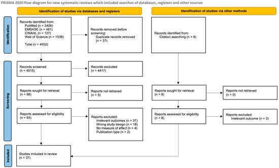 A total of 4552 (2406 from PubMed + 481 from EMBASE + 127 from CINAHL + 1538 from Web of Science) studies were initially identified through a comprehensive search of electronic databases and additional sources. After removing duplicates, 4515 studies were eligible for initial review. Following screening of study titles and abstracts, 106 studies were selected for full-text review. Five studies did not have available full texts. Following the full-text review, 37 publications were finally included in this systematic review based on the predefined inclusion and exclusion criteria (Figure 1).