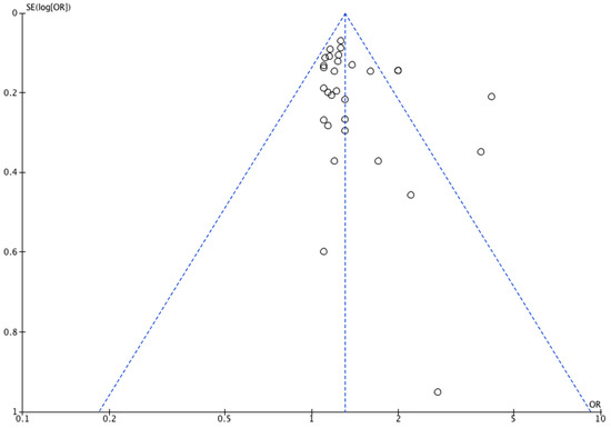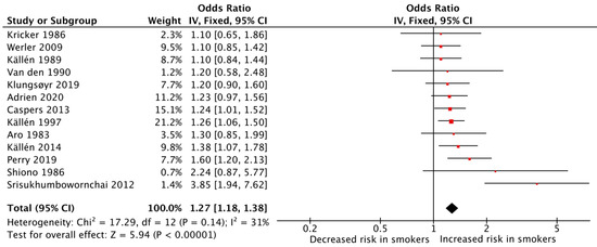 In total, 31 studies provided data on the association between maternal cigarette smoking during pregnancy and congenital limb reduction defects, and 13 were of sufficient quality for quantitative analysis. The meta-analysis of these studies showed that maternal cigarette smoking during pregnancy was significantly associated with an increased risk of congenital limb reduction defects (pooled OR: 1.27, 95% CI: 1.18–1.38, Figure 6). The heterogeneity among the studies was low (I2 = 31%).