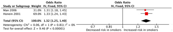 In contrast, the meta-analysis of studies that reported the outcome of polydactyly/syndactyly/adactyly was found to be significant, indicating an increased risk of children developing polydactyly or syndactyly or adactyly among mothers who smoked during pregnancy (pooled OR: 1.32, 95% CI: 1.25–1.40, Figure 5). Heterogeneity was low (I2 = 0%). However, this analysis was limited by the fact that it only included two studies.