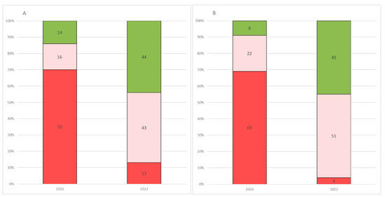 Significant differences between 2016 [13] and 2022 responses were found in 6 of the 7 (86%) close-ended questions available in both questionnaires (Table 5, Figure 1A,B).