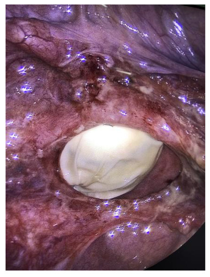 - Thubert, T.; Pourcher, G.; Deffieux, X. Small bowel volvulus following peritoneal closure using absorbable knotless device during laparoscopic sacral colpopexy. Int. Urogynecol. J. 2011, 22, 761–763. [Google Scholar] [CrossRef] [PubMed]