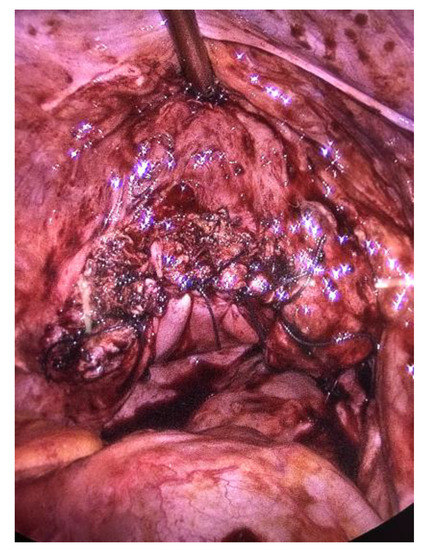 - Uccella, S.; Ghezzi, F.; Mariani, A.; Cromi, A.; Bogani, G.; Serati, M.; Bolis, P. Vaginal cuff closure after minimally invasive hysterectomy: Our experience and systematic review of the literature. Am. J. Obstet. Gynecol. 2011, 205, 119.e1–119.e12. [Google Scholar] [CrossRef]