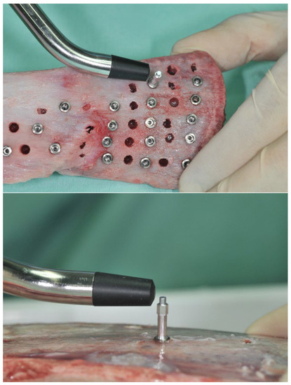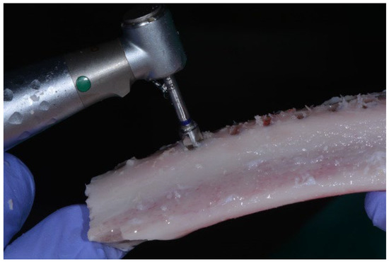 The implants were placed in fresh calf ribs, simulating bone quality type II according to the expertise of the experienced clinician, who performed the insertion of the implants and compared the bone radiographs with the images of the Lekholm and Zarb classification by bone density [41]. All implants used were 10 mm in length and 4 mm in diameter. Figure 2 shows the implantation in bovine bone.