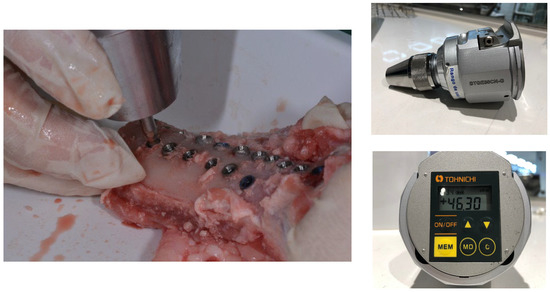 The bone site preparations were performed according to the manufacturer’s protocol by an experienced clinician. The protocol began with the use of a sequence of drills, starting with a lanceolated marking bur, continuing with different pilot drills of growing diameter (1.2, 2.8, and 3.5 mm, and finishing with a profile bur. To insert the implant, a low-speed (5 rpm) surgical motor with handpiece was used. After that, a hand torque wrench was used to submerge the implants up the right level. All implants were 4 × 10mm. The osteotomy for each implant was performed under abundant saline solution irrigation with a minimum distance of 4 mm between osteotomies. The rough/smooth interface was placed at the bone crest level for the tissue-level implants (groups A, C, and E), while bone-level implants (groups B, D, and F) were placed at the crestal level. Implant insertion was performed manually, and IT was registered using a calibrated Analog Dynamometer—BTG90CN (Tohnichi, Tokyo, Japan). Figure 3 shows the torquemeter used for the determination of insertion torque.