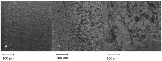 The different topographies studied. (A) Minimally rough surfaces: Sa values 0.5–1 µm. (B) Moderately rough surfaces: Sa values 1–2 µm. (C) Rough surfaces: Sa values > 2 µm.