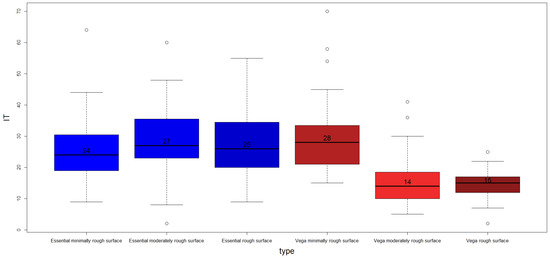 Boxplot of IT by dental implant type. The median values are included.