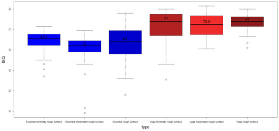 The mean IT of the whole sample is 23.87 ± 11.56 N/cm and the mean ISQ value of the whole sample is 67.12 ± 8.75. The descriptive analysis of the study sample’s rugosity is shown in Table 3. The results obtained show statistically significant differences in the medians among groups for both the IT (H = 96.82.df = 5), with a p-value < 2.2 × 10−16, and ISQ variables (H = 94.92. df = 5. p-value = 2.2 × 10−16). The Pearson correlation value of the ISQ and IT variablea is 0.059 (p-value = 0.371), which can be considered a low value. All the ISQ values are shown in Supplementary File (Table S1) and the IT values (Table S1) for different roughness and dental implants.