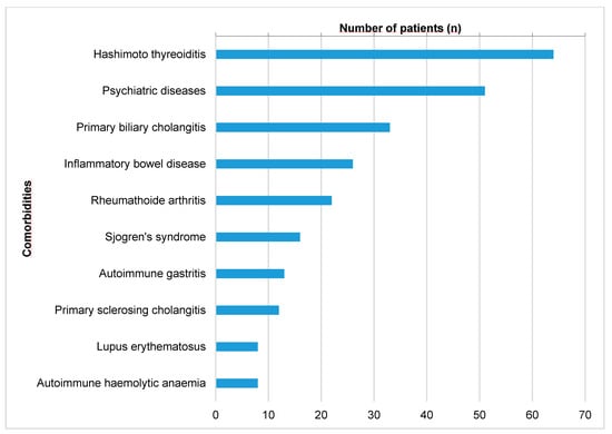 The patients were screened for concomitant autoimmune diseases at first diagnosis and in case of clinical suspicion during the course. Autoimmune thyroiditis was the most common overlapping autoimmune disease affecting 64/535 (11.96%) AIH patients. Chronic cholestatic liver diseases were present in 55/535 (8.41%) AIH patients (primary biliary cholangitis (PBC) 6.17% and primary sclerosing cholangitis (PSC) 2.24%). Furthermore, 38/535 patients (7.10%) suffered from concomitant inflammatory rheumatic diseases (22 rheumatoid arthritis, 16 Sjögren’s syndrome (thereof 5 with sicca syndrome), and 26/535 patients (4.86%) from inflammatory bowel diseases (18 ulcerative colitis, 12 Crohn’s disease). Concomitant autoimmune diseases in patients with AIH are shown in Figure 1. Interestingly, 51/535 patients (9.53%) with AIH had concomitant psychiatric diseases with depressive symptoms.
