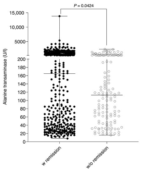 A total of 417/535 (77.94%) patients were treated with high-dose steroids due to acute AIH (prednisolone 1–2 mg per kg per day or budesonide 9 mg per day) as induction therapy, which was then slowly tempered down by scheme to a low-dose maintenance therapy or completely withdrawn. If steroids were given over a time period of >8 weeks, vitamin D prophylaxis was administered. For maintenance therapy, azathioprine was the first-line treatment (n = 380/535, 71.03%). By use of this scheme, 315/535 (58.88%) patients attained complete biochemical responses according to the definition of the IAIHG. In case of azathioprine intolerance (20/380; 5.26%) or insufficient response (40/380; 10.53%), immunosuppressive therapy was switched to second-line immunomodulatory drugs such as 6-mercaptopurine (first second-line alternative), mycophenolic acid (second second-line alternative), ciclosporin A (third second-line alternative), or tacrolimus (fourth second-line alternative). The CD20 antibody rituximab was administered in only two patients (0.37%) refractory to first- and second-line therapies. By use of pharmacological therapies, a total of 397/535 (74.21%) patients achieved sustained biological and clinical remission. However, 138/535 patients (25.79%) were refractory to any therapy and did not achieve a remission state. Interestingly, higher ALT levels at initial presentation were associated with higher remission rates (ALT remission 163,5 U/l vs. ALT no remission 111 U/l, p = 0.0424, Figure 2).