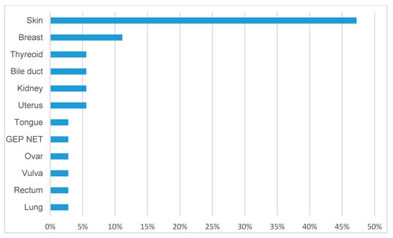 The development of malignant tumor diseases is demonstrated in Figure 3. The vast majority were tumors of the skin (nearly 50% of all tumors), e.g., melanoma, squamous cell carcinoma, and basal cell carcinoma, respectively. Skin cancer is a well-defined complication of immunomodulatory drugs, particularly azathioprine [46,47,48]. Patients treated with these agents should, therefore, routinely be monitored by a dermatologist. Hepatocellular carcinoma (HCC), as a complication of chronic liver disease, is one of the most common malignancies worldwide, and its incidence is rising. Most HCCs develop on the basis of liver cirrhosis (>90%) but can in rare cases also arise in non-cirrhotic livers. Although some studies report on HCC occurrence for patients with AIH, the risk for HCC seems to be substantially lower compared to other entities such as, for example, viral hepatitis or non-alcoholic steatohepatitis. In their review, including 11 studies with 8460 patients between 1989 and 2016, Valean and colleagues reported HCC occurrence rates for AIH patients with cirrhosis from 0.2 to 12.3%, while the proportion of non-cirrhotic HCCs was estimated at 1.03% [49]. In addition, Teufel et al. analyzed 431 patients with AIH and found 3 HCCs, all of them had liver cirrhosis [50]. Our analysis confirms these previously published data. HCC incidence was rare with 1.12% throughout the whole study population, while all HCCs occurred in cirrhotic patients (HCC incidence in AIH-induced cirrhosis was 3.6%). None of the non-cirrhotic AIH patients were diagnosed with or developed HCC.