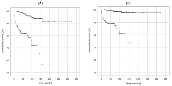 A total of 169/535 patients (31.59%) presented with liver cirrhosis due to AIH at initial diagnosis. Diagnosis of liver cirrhosis was based on clinical, laboratory, imaging, transient elastography (Fibroscan), and/or histological findings. Overall mortality was 9.16% (49/535 patients), while liver-associated mortality was 4.67% (25/535 patients). Mortality was strongly associated with disease remission (complete biochemical response), which is demonstrated in Figure 4A,B. In addition, mortality was increased when concomitant chronic inflammatory bowel disease was present (10-year survival AIH with or without Crohn’s disease 83% vs. 94%, p = 0.028; 10-year survival AIH with or without ulcerative colitis 76% vs. 94%, p = 0.026).