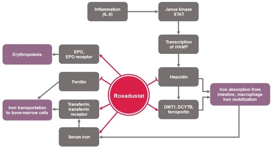 Hypoxia-inducible factor (HIF) prolyl hydroxylase (PH) inhibitors represent a novel class of orally active small molecule drugs that transiently inhibit the HIF-PH enzymes, which causes the cellular accumulation of HIFs and induces activation of the genes involved in erythropoiesis, even in the presence of normal oxygen tension (i.e., transient “pseudohypoxic” state) []. HIF-PH inhibitors simulate hypoxia in erythropoietin-producing cells, stimulating endogenous erythropoietin synthesis and theoretically improving the supply of iron for erythropoiesis. Furthermore, HIF-PH inhibitors may reduce hepcidin levels, resulting in increased iron mobilization that may overcome functional iron deficiency associated with hyporesponsiveness to erythropoiesis-stimulating agents (ESAs) [,,,] (Figure 1).