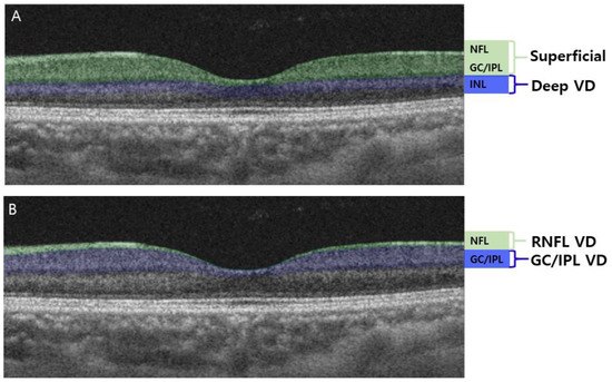 Macular VD is associated with glaucoma. A decrease in superficial and deep macular VDs is observed in glaucomatous eyes compared to healthy and glaucoma-suspect eyes [11]. A correlation exists between the superficial macular VD and the thickness of RNFL and ganglion cell (GC)/IPL. Additionally, deep macular VD is related to visual field (VF) progression and paracentral scotoma, independent of structural parameters [12,13]. However, various terms have been used to describe the layers of macular VD, which are not uniform, as different OCTA devices have been used (AngioVue OCTA -Optovue Inc. Fremont, CA, USA; AngioPlex–Zeiss Meditec, Inc., Dublin, CA, USA; DRI OCT Triton, Topcon, Tokyo, Japan) to evaluate macular VD changes in many studies [13,14,15,16,17,18,19,20,21]. Automated layer segmentation applied to OCT instrument software has shown the superficial macular VD comprising mainly of RNFL, GCL, and IPL from the internal limiting membrane (ILM) to the inner border of the inner nuclear layer (INL). Deep macular VD comprises the INL from the inner to outer borders where the bipolar cells are located.