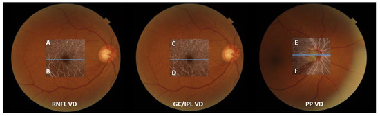 VD measurements from OCTA images were performed as described in previous studies [24,27]. Only the images with a quality score >60 were selected. Eyes with poor image quality due to blurring, fixation, and macular segmentation errors were excluded. OCTA measurements were not performed if a disc hemorrhage occurred that day due to the possible influence of the disc hemorrhage on the PP VD image quality. The mean threshold algorithm was used to create an 8-bit binarized image. As the white pixels represented “vessel” and black pixels represented “background”, the VD was calculated as the percentage of the white pixel area divided by the total image area. VDs at the superior and inferior hemiretina were also measured separately at the optic disc and macular regions. These measurements were divided according to the center of the disc for peripapillary VD and the center of the fovea for macular VD. The VD ratio was defined as the ratio of the impaired half of the VD divided by the VD of the less affected side to show the degree of decompensation of the impaired half. As all 66 eyes included in this study had inferior RNFL defects, the ratio was calculated as the ratio of the inferior to superior VD. The ratios between the RNFL VD and PP VD, GC/IPL VD, and PP VD of the inferior hemiretina were calculated to determine the factors associated with changes in the RNFL and GC/IPL VDs, not as a result of decreased PP (Figure 2).