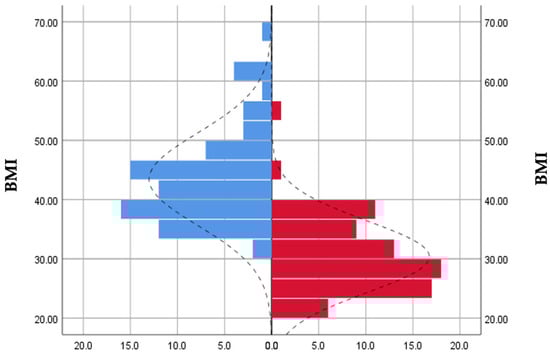 Preoperative (blue) and postoperative (red) BMI distribution.