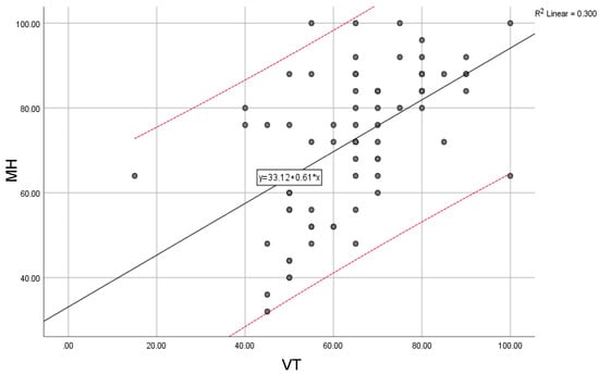 Mental health (MH) compared with the general trend for vitality (VT) scores; “y” indicates the overall trend of the scores.