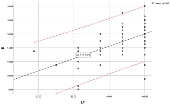 Environmental scores (E) compared with the general trend for social functioning (SF) scores; “y” indicates the overall trend of the scores.