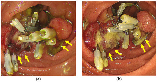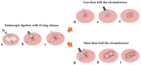 - Nishiyama, N.; Kobara, H.; Kobayashi, N.; Chiyo, T.; Tada, N.; Kozuka, K.; Matsui, T.; Yachida, T.; Fujihara, S.; Shi, T.; et al. Efficacy of endoscopic ligation with O-ring closure for prevention of bleeding after gastric endoscopic submucosal dissection under antithrombotic therapy: A prospective observational study. Endoscopy 2022, 53, 1078–1084. [Google Scholar] [CrossRef] [PubMed]