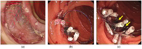 - Tashima, T.; Nonaka, K.; Ryozawa, S.; Tanisaka, Y. Endoscopic purse-string suturing with multiple over-the-scope clips for closure of a large mucosal defect after duodenal endoscopic submucosal dissection. Dig. Liver Dis. 2018, 50, 1368. [Google Scholar] [CrossRef]