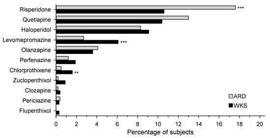 Antipsychotic purchases within one year of diagnosis. Hommel’s multiple comparison procedure was used to correct significance levels for post hoc testing; ** p < 0.01, *** p < 0.001. ARD: alcohol-related dementia; WKS: Wernicke–Korsakoff syndrome.