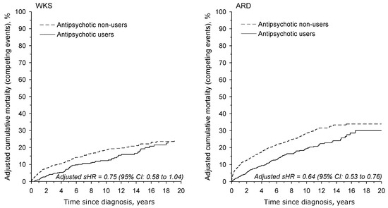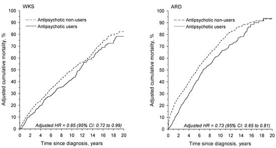 The age- and sex-adjusted cumulative mortality of antipsychotic users was significantly lower than that of non-users, as shown in Figure 2. The adjusted HR for antipsychotic users was 0.85 (95% CI: 0.72–0.99) in the WKS group and 0.73 (95% CI: 0.65–0.81) in the ARD group relative to antipsychotic non-users.