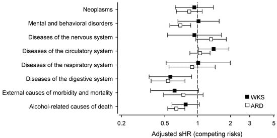 Figure 4 shows the adjusted mortality of the antipsychotic users compared with the antipsychotic non-users (represented by the dotted line, i.e., 1). The sHRs were stratified by the causes of death using ICD-10 categories. The mortality of antipsychotic users due to diseases of the digestive system was lower in both the WKS patients (sHR: 0.56, 95% CI: 0.36–0.88) and ARD patients (sHR: 0.54, 95% CI: 0.37–0.77). The ARD patients using antipsychotics were also significantly less likely to die of mental and behavioral disorders (sHR: 0.69, 95% CI: 0.56–0.87) than the antipsychotic non-users. The antipsychotic users with ARD were more likely to die of diseases of the circulatory system (sHR: 1.40, 95% CI: 1.01–1.94) than the antipsychotic non-users. Although not statistically significant, antipsychotics users had a tendency towards a lower mortality of external causes of death—a category that includes deaths caused by, for instance, intoxication, accidents, assault, and suicide. The mortality due to alcohol-related causes was lower in both the WKS and ARD patients using antipsychotics, as recounted in the previous paragraph and shown in Figure 2, although the difference was significant in the ARD group only.