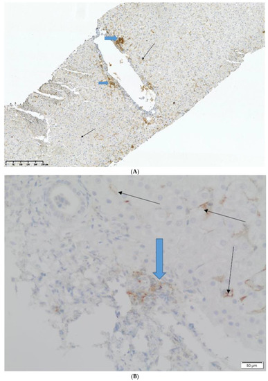 There was no chronic rejection (ductopenia) or AMR incident in any biopsy (C4d stained negative in all biopsies, no portal microvascular endothelial cell enlargement). PD-L1, if present, was positive either on allograft lymphocytes or endothelial cells in both groups (Figure 1A,B); it was not positive in the hepatocytes, regardless of if we were examining the study or control group.