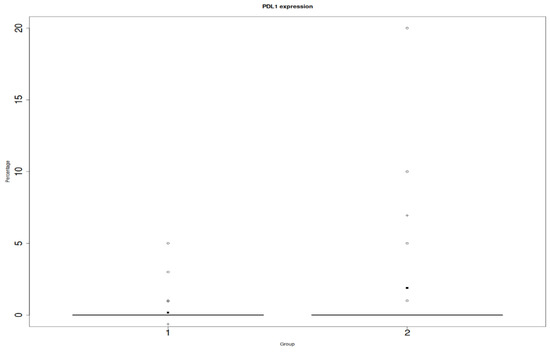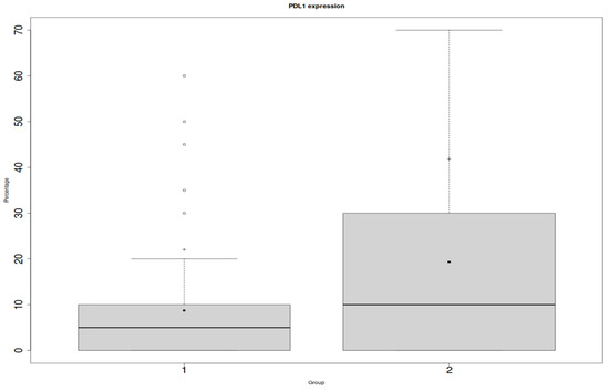 Y: percentage of positive cells in in the entire biopsy; x: PD-L1 on inflammatory infiltrates; 1: protocol biopsies; 2: ACR biopsies. Differences were considered statistically significant when p-values were less than 0.05 (p < 0.05).
